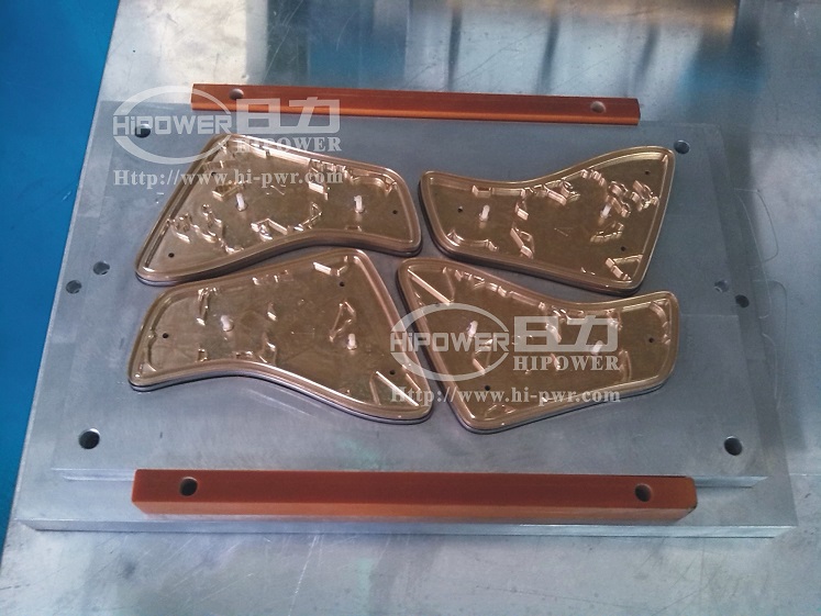 3.制作扶持器,上方貼泡棉,其高度約低于銅模面3-5㎜。左右兩端各制作一支手把分別固定于鋁板上,以利于搬運(yùn)。再確認(rèn)模具各部位尺寸是否正確。試模(電流、壓力、屏流會(huì)因模具之大小而有差異)。遮日板熔斷鋼模(又分為外型全周熔斷及下緣車縫僅上緣熔斷兩種)制作方式同為: 依模具圖申購(gòu)所須的材料規(guī)格 ,上下模板鉆孔型削,上下模體外型以CAM程式轉(zhuǎn)換型削后送外托工熱處理HRC58度。 研磨后組立&仕上。