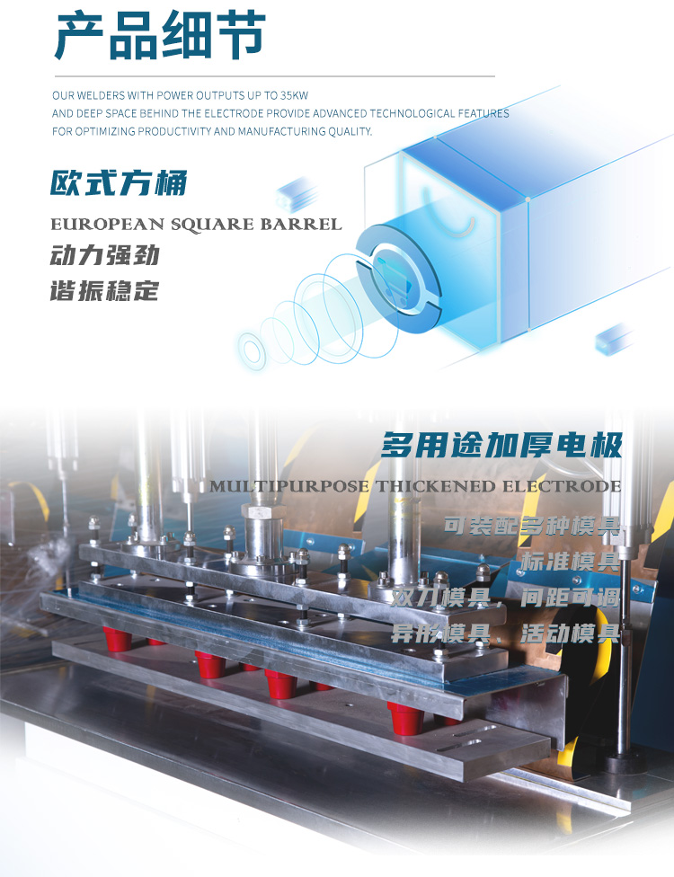 機器可連續(xù)壓線接熔,接熔長度可以自由定制。歐洲制式方形高頻震蕩箱,出力更大,更加穩(wěn)定。機器為C型結構,機身