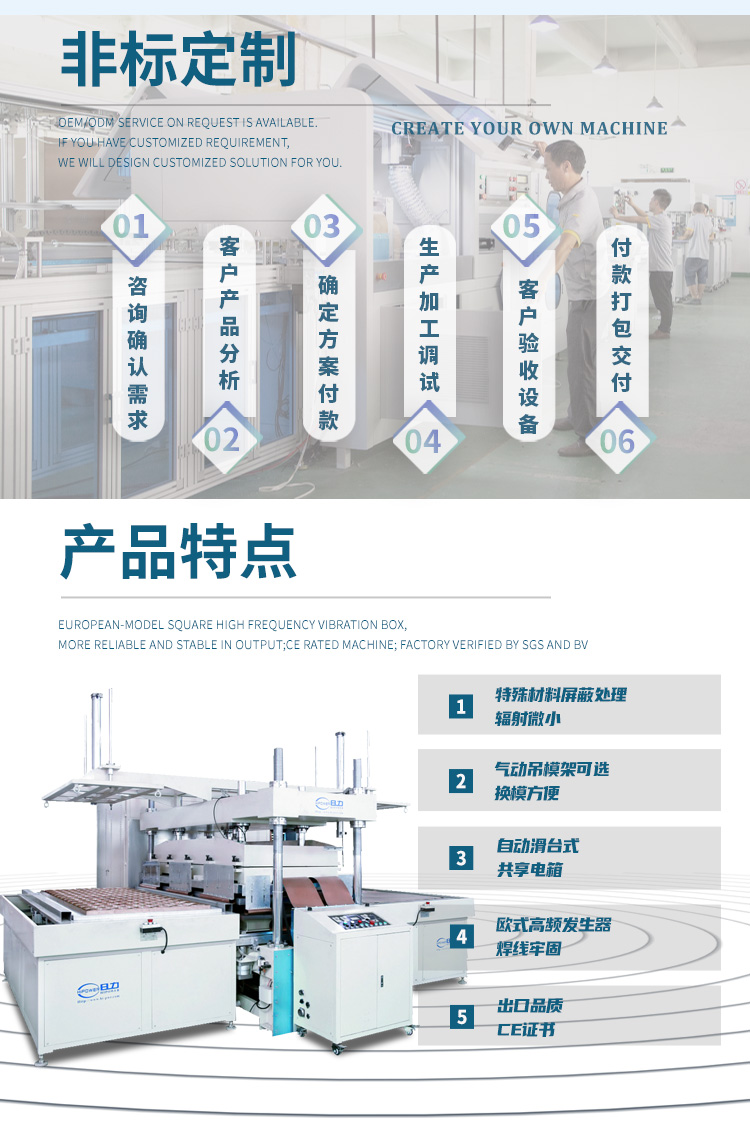 | 機(jī)器特點(diǎn): | 采用強(qiáng)力式機(jī)頭,壓力輕重可任意調(diào)節(jié);設(shè)計利用肘節(jié)推動杠桿原理,能使壓力均勻,上落平穩(wěn),以配合不同熔接深淺度的需要;特別適合用于難對位產(chǎn)品。 |