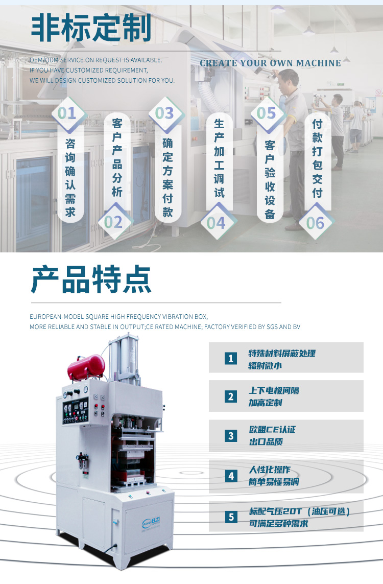 主要用于 汽車過濾器熔接機,空氣過濾袋熔接機,汽車濾芯熔接機,汽車風格熔接機,空調(diào)濾清器熔接機,空氣濾清器熔接機。主要用于空調(diào)濾清器,俗稱花粉濾清器的熔接成型。也可用于需要高周波熔接同時又必須同步裁斷的產(chǎn)品加工,高周波機的工作原理是利用高周波先熔接再通過機器配有的壓力裝置同時切斷。因為是同時完成,所以稱為高周波同步熔斷機。也稱為高周波熔斷機、熔斷機、高周波同步裁斷機、高周波裁斷機。