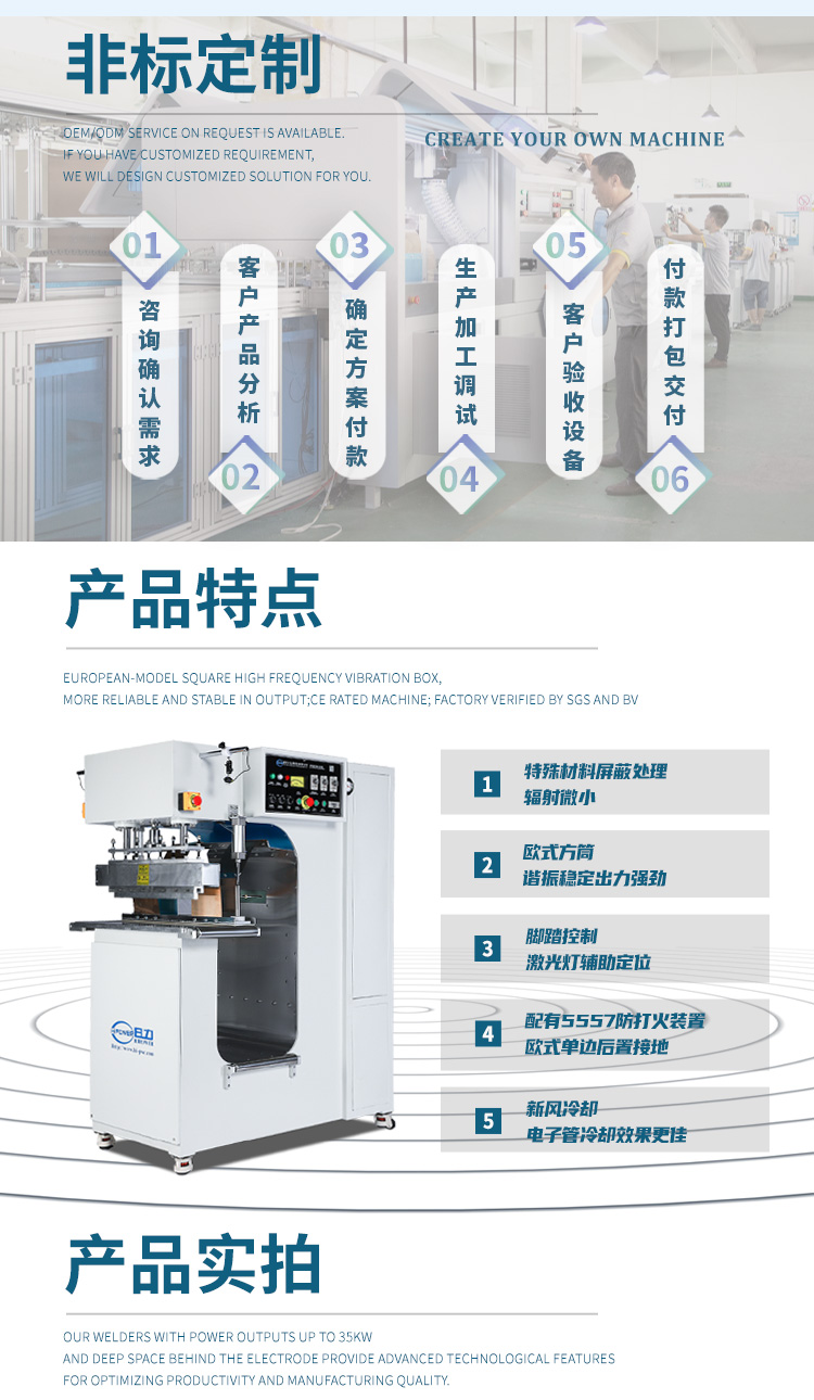 | 機(jī)器特點(diǎn): | 5KW行業(yè)入門級(jí)機(jī)器;腳踏控制 該機(jī)器主要采用高壓變壓器整流自激高頻電子管振蕩瞬間產(chǎn)生高頻電磁波電場(chǎng),利用被加工的PVC、TPU、等塑膠、塑料原材料在高頻電磁波電場(chǎng)內(nèi)其被焊接塑膠、塑料材料的內(nèi)部分子產(chǎn)生極性化生熱,加上一定的壓力使所需要熱合焊接的塑料、塑膠產(chǎn)品達(dá)到熔接封口作用,機(jī)器結(jié)構(gòu)和模具等可根據(jù)客戶要求做調(diào)… |