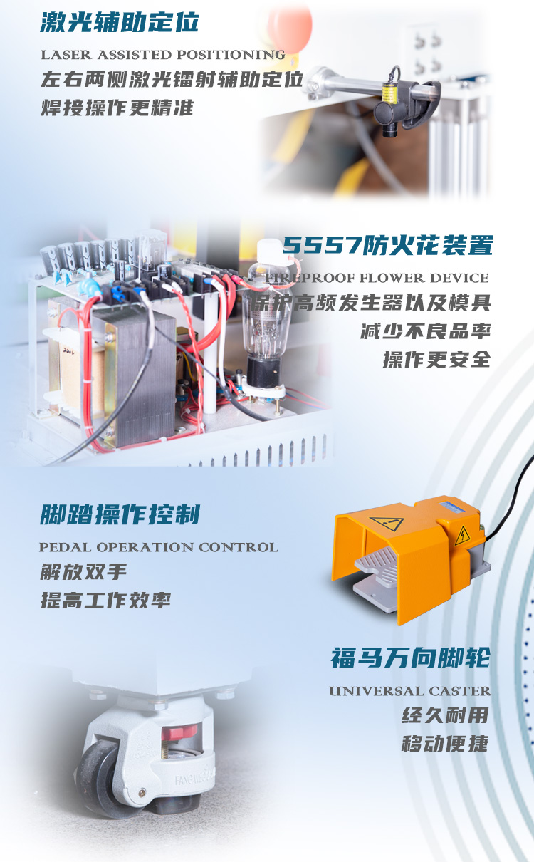 ※高頻振蕩系統(tǒng)為歐式方形同軸結(jié)構(gòu),高周波輸出的力量穩(wěn)定強(qiáng)大。高周波熔接