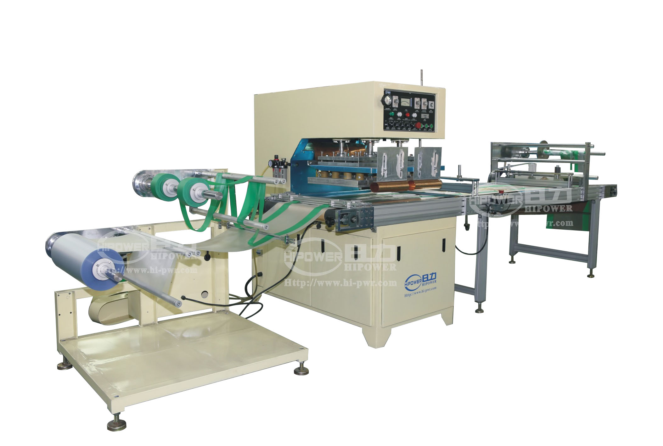 適用于PVC相冊,內(nèi)頁,文件夾高周波熔接制造,PVC、EVA、P膠盒柔軟壓線等連續(xù)作業(yè)的高同波熔接,自動收取廢料,產(chǎn)品自動流入后備產(chǎn)品箱。