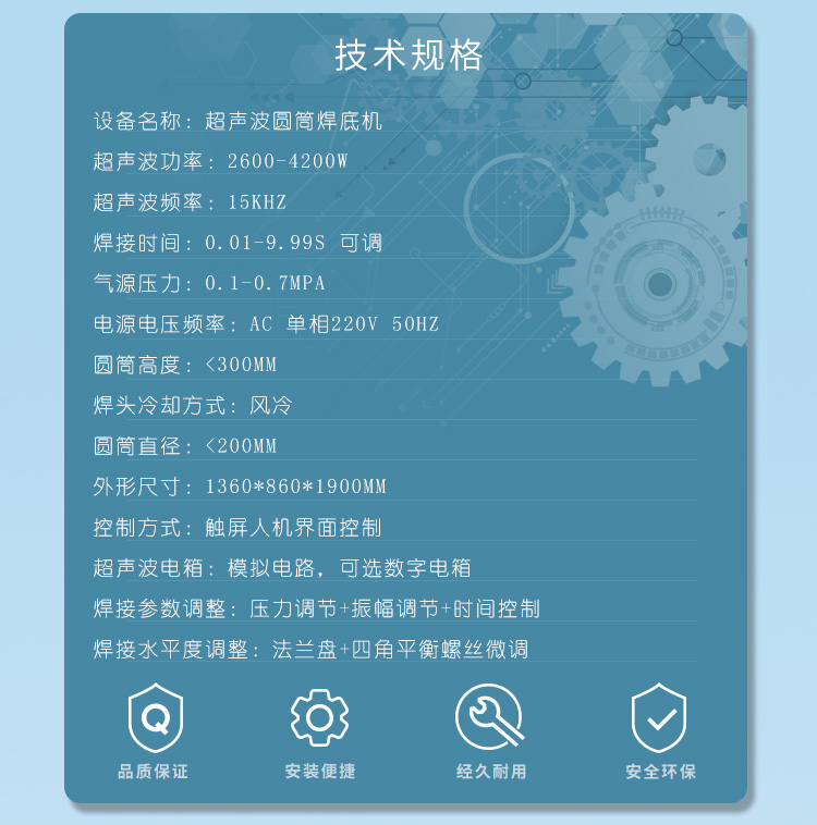 三,超聲波圓筒焊底機 技術(shù)規(guī)格: