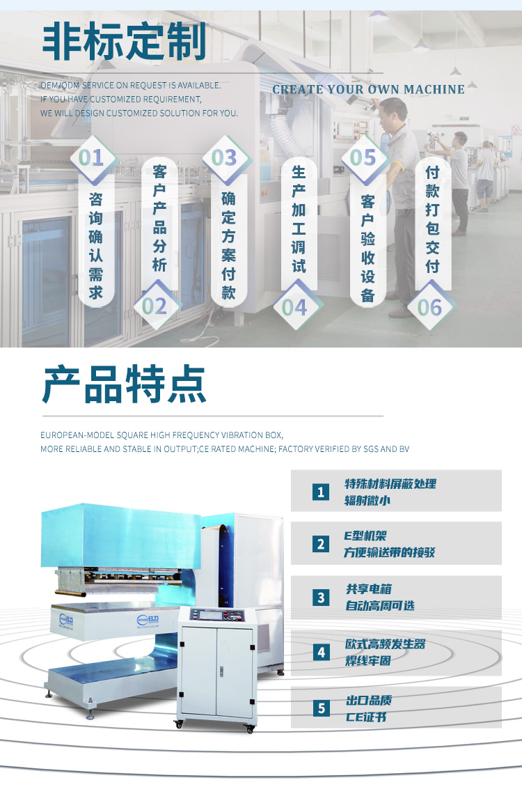 高周波輸送帶熔接機 工作原理:是利用機器上下極之間的高頻變化的磁場,促使塑料件內(nèi)部分子運動摩擦產(chǎn)生熱量,然后借助機器壓力和配套模具作用下達到熔接定型的效果。