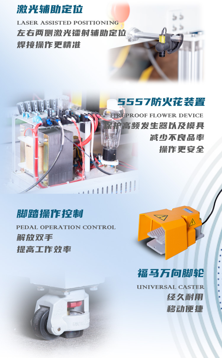 ※高頻振蕩系統(tǒng)為歐式方形同軸結(jié)構(gòu),高周波輸出的力量穩(wěn)定強大。高周波熔接