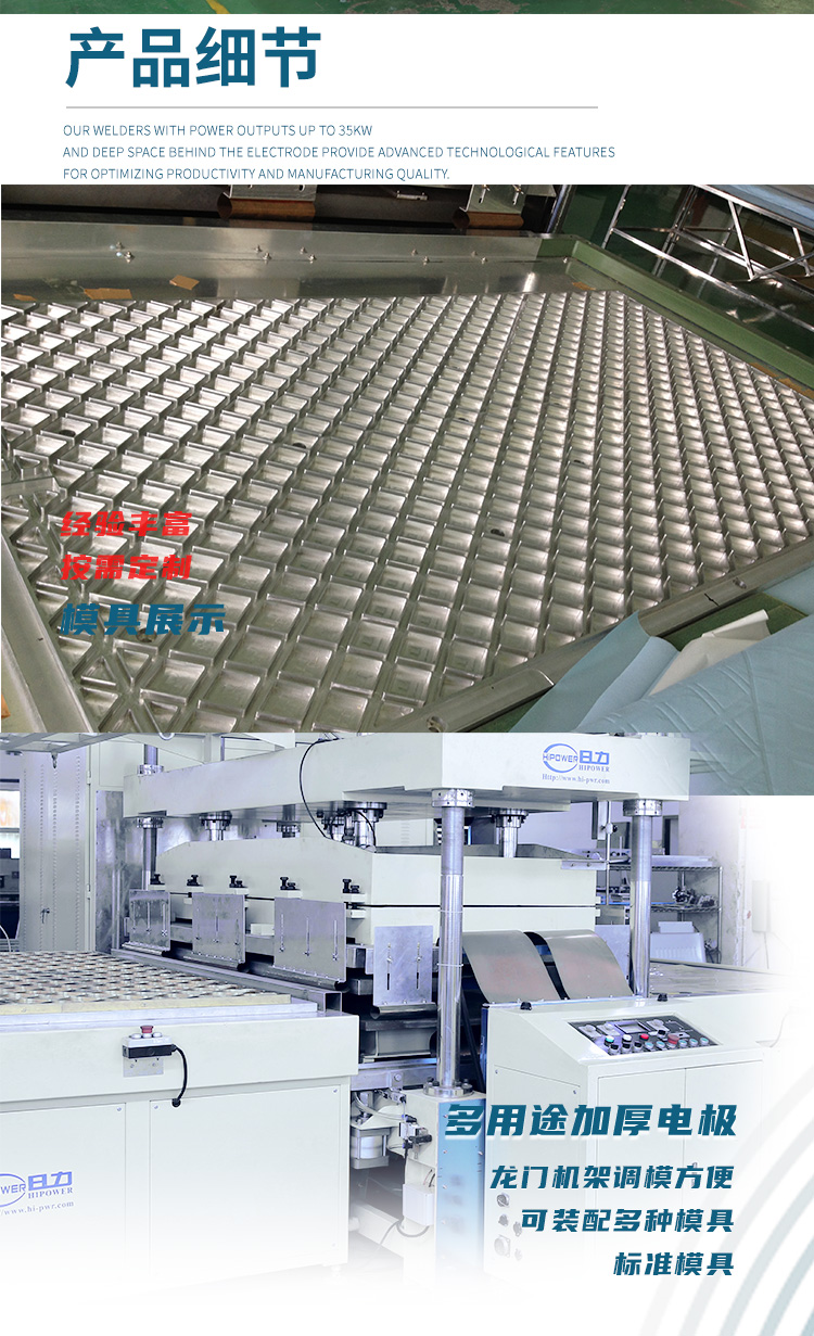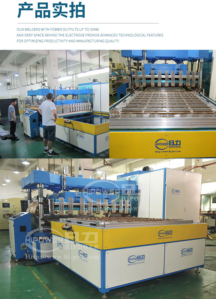 由高周波系統(tǒng)、(含高周波電箱、高周波控制配電箱、滑臺(tái)緩沖控制、高周波龍門(mén)式四柱機(jī)架結(jié)構(gòu)) 滑臺(tái)式工作臺(tái)系統(tǒng)、高周波防護(hù)系統(tǒng)、高周波油壓驅(qū)動(dòng)系統(tǒng),獨(dú)立的水冷系統(tǒng)等結(jié)構(gòu)組成。本設(shè)備是一套自動(dòng)高周波焊接裝置,在滑臺(tái)式工作臺(tái)手工放入工件,由手工定位,設(shè)備將工件自動(dòng)送至高周波工作區(qū)域進(jìn)行高周波焊接;完成焊接的產(chǎn)品經(jīng)滑臺(tái)式工作臺(tái)退回后取出。從而完成一個(gè)完整的流程;作業(yè)員按設(shè)備設(shè)定的節(jié)拍持續(xù)置入產(chǎn)品原料,高周波作業(yè)節(jié)拍高效率地自動(dòng)化完成熔接作業(yè)。用戶(hù)可自由設(shè)置作業(yè)時(shí)間,一般為10--15秒一個(gè)作業(yè)節(jié)拍。