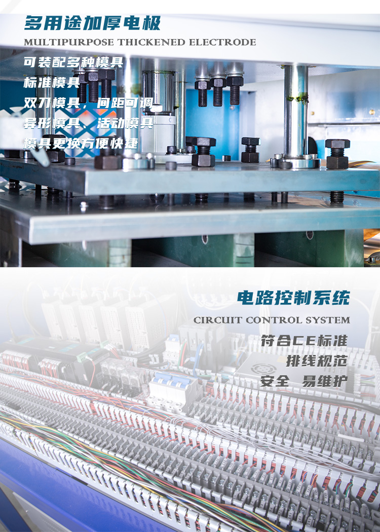 時切斷,基本上是同時完成。適用于大面積的高周波熔接裁斷,坐墊成型,大型腳墊成型,APET,PETG,GAG等環(huán)保材料的高周波柔軟線