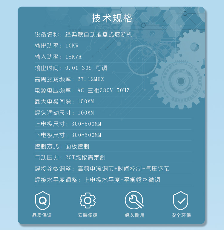單頭推盤式高周波塑料熔接機(jī)的技術(shù)規(guī)格: