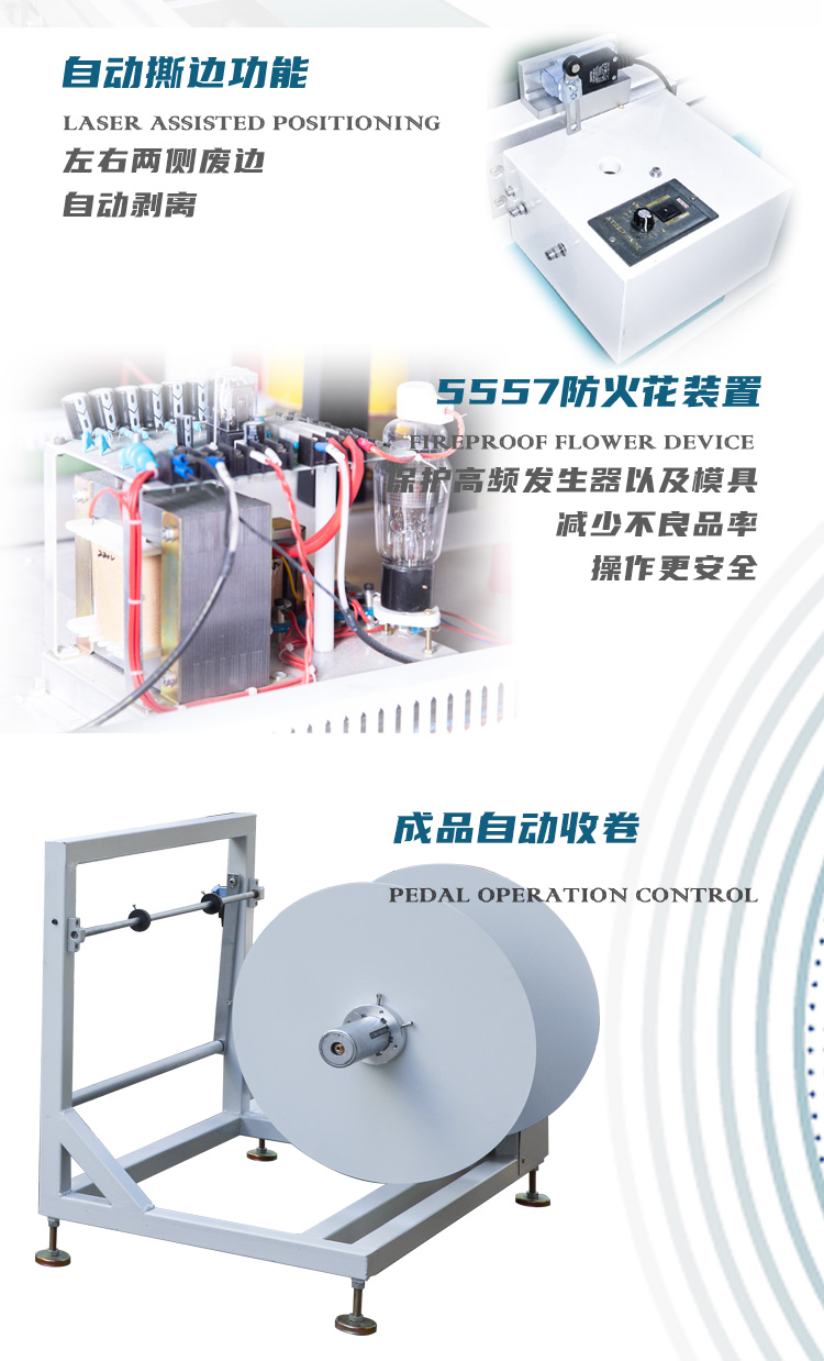 | 機器特點: | 卷對卷自動作業(yè),產量可達1500米/8小時,自動收卷1. 控制面板或PLC觸屏操作,方便簡單。2. 對位準確,焊接質量高,無需移動材料。3. 焊接速度高達到5-10米每分鐘。4. NL-5557火花保護系統(tǒng)。5. 試用范圍廣泛:PVC地熱膜類,6、自動裁切 |
