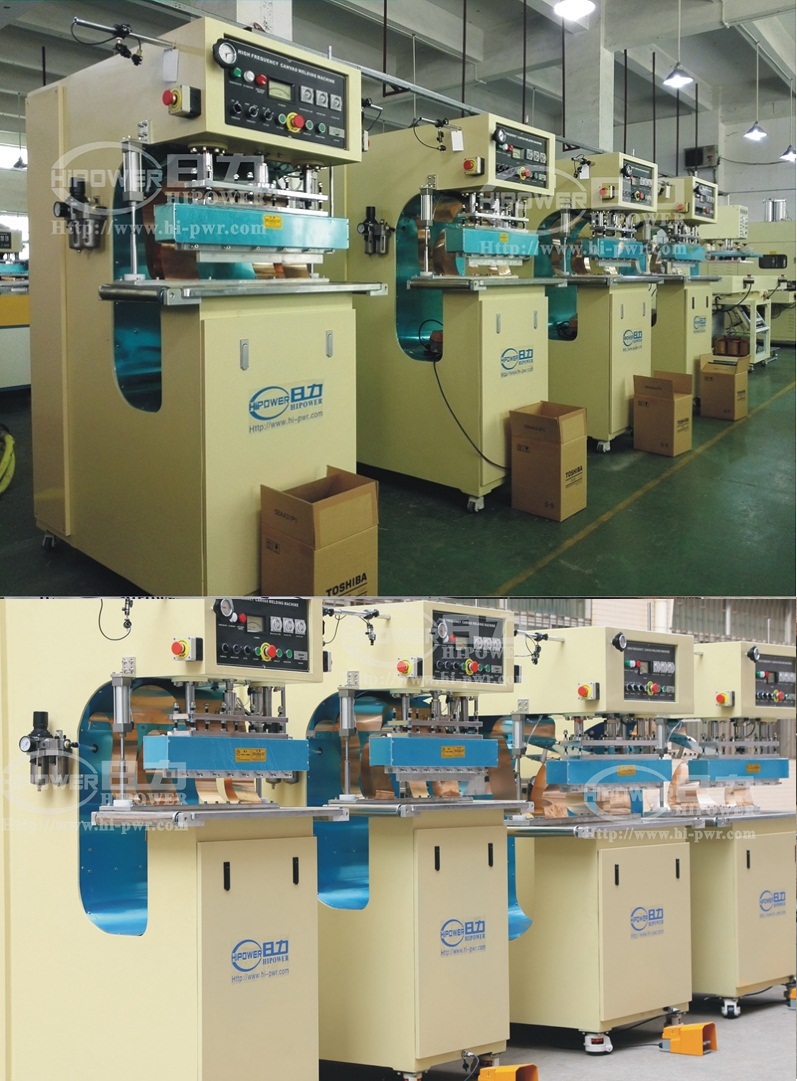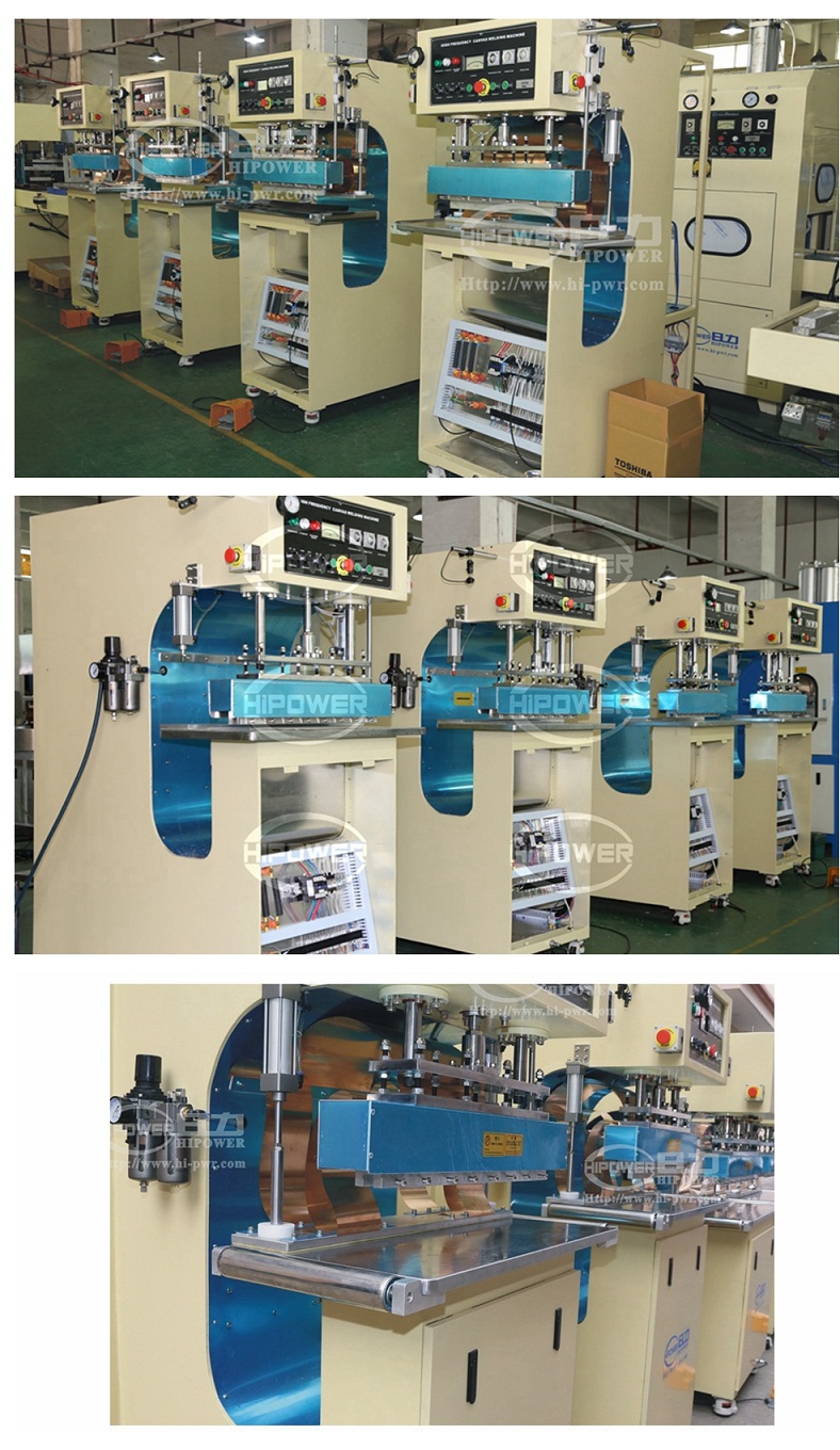 該機器主要采用高壓變壓器整流自激高頻電子管振蕩瞬間產(chǎn)生高頻電磁波電場,利用被加工的PVC、TPU、等塑膠、塑料原材料在高頻電磁波電場內其被焊接塑膠、塑料材料的內部分子產(chǎn)生極性化生熱,加上一定的壓力使所需要熱合焊接的塑料、塑膠產(chǎn)品達到熔接封口作用,機器結構和模具等可根據(jù)客戶要求做調整